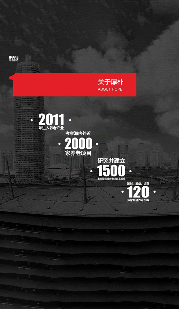厚樸養(yǎng)老集團(tuán)成立于2011年,總部設(shè)在鄭州,致力于成為中國最受信賴的健康養(yǎng)老產(chǎn)業(yè)運營服務(wù)商,業(yè)務(wù)涵蓋養(yǎng)老產(chǎn)業(yè)研究、康養(yǎng)項目咨詢策劃、養(yǎng)老項目籌備與營銷顧問、養(yǎng)老服務(wù)業(yè)第三方評估與鑒定、養(yǎng)老項目運營管理等。