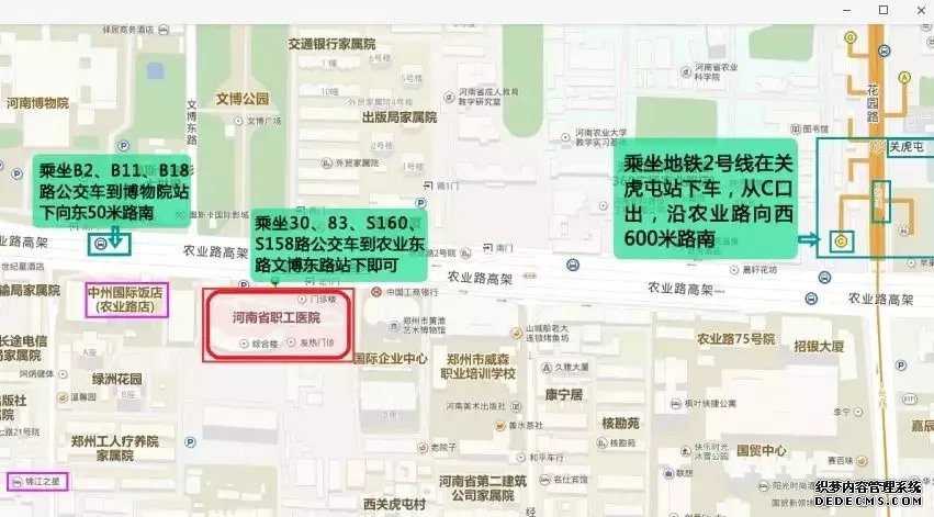 一、鄭州東站起:坐地鐵1號線至紫荊山站C口出,步行122米至紫荊山路順河路站,乘坐93路公交車至農業路文博東路站下車,步行 260米至河南省職工醫院。