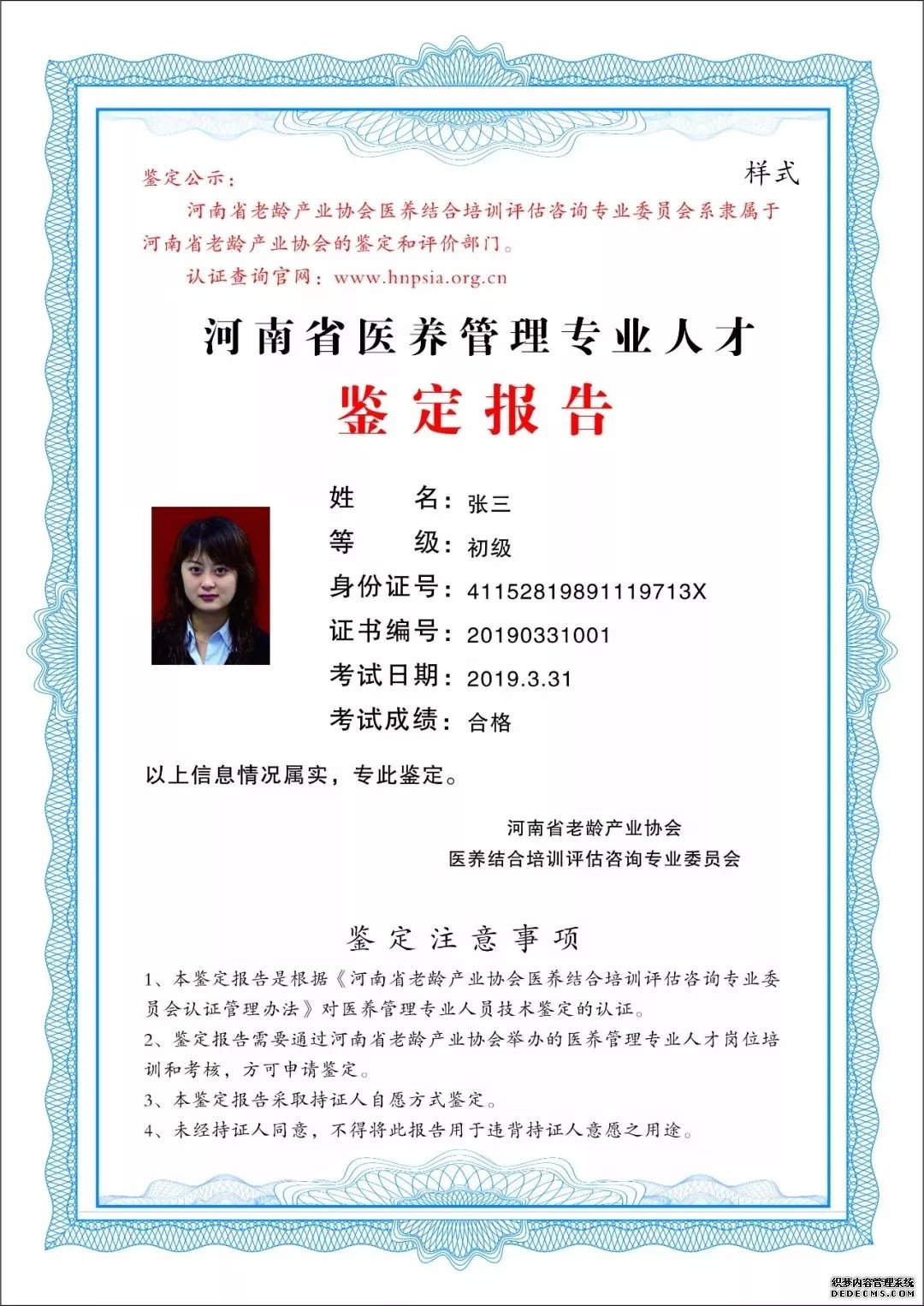 (2)培訓結束后,學員可持《培訓證書》向協會醫養結合培訓評估咨詢專業委員會申請鑒定,鑒定通過頒發《河南省醫養管理專業人才鑒定報告》(見附件3)